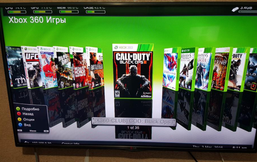 Кроме этого, в меню Freestyle есть информация о погоде (если настроить), о температуре видеочипа и процессора, а также IP-адрес консоли для подключения к ПК по FTP. Само меню Xbox 360 с Freeboot тоже меняется.